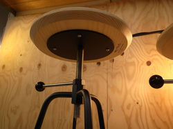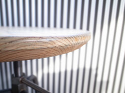 高さ調整可能なスツールです。脚先端には首振りアジャスター付き。多少凸凹した床でも安定します。座面を回して高さ調整、決まったらロックレバーを締めてロック!